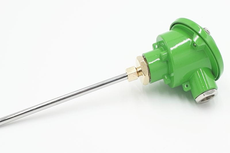 Czujnik w postaci prostego przewodu płaszczowego zakończonego głowicą. Do wyboru głowica B lub NA Długość czujnika mierzona jest od końca pomiarowego do podstawy króćca pod głowicą