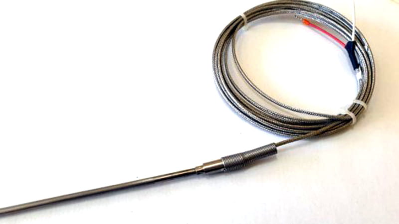 - Czujnik zakończony przewodem w izolacji z włókna szklanego z oplotem ze stali nierdzewnej. Długość przewodu 3000mm. Max temp. pracy przewodu 400°C. Przewód połączony z częścią pomiarową za pomocą tulejki o średnicy 8mm i sprężyną zabezpieczającą przewód przy wygięciu